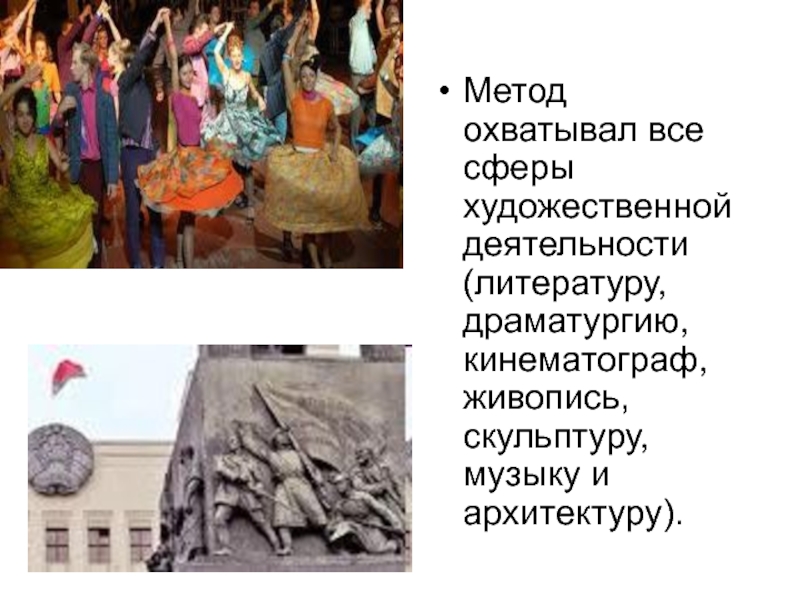Метод охватывал все сферы художественной деятельности (литературу, драматургию, кинематограф, живопись, скульптуру,