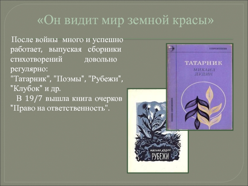 Слайд 15 После войны много и успешно работает, выпуская сборники стихотворений
