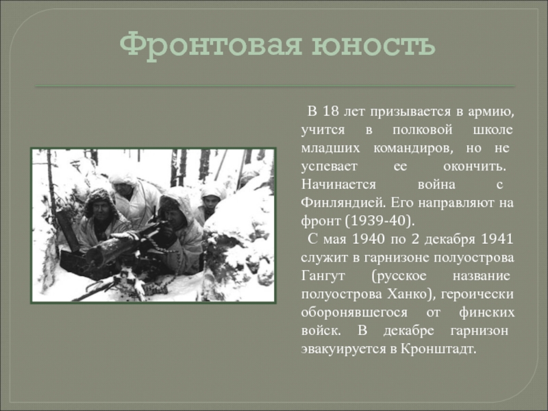 С мая 1940 по 2 декабря 1941 служит в гарнизоне полуострова Гангут (русское название полуострова Ханко), героически оборонявшегося от финских войск. В декабре гарнизон эвакуируется в Кронштадт.