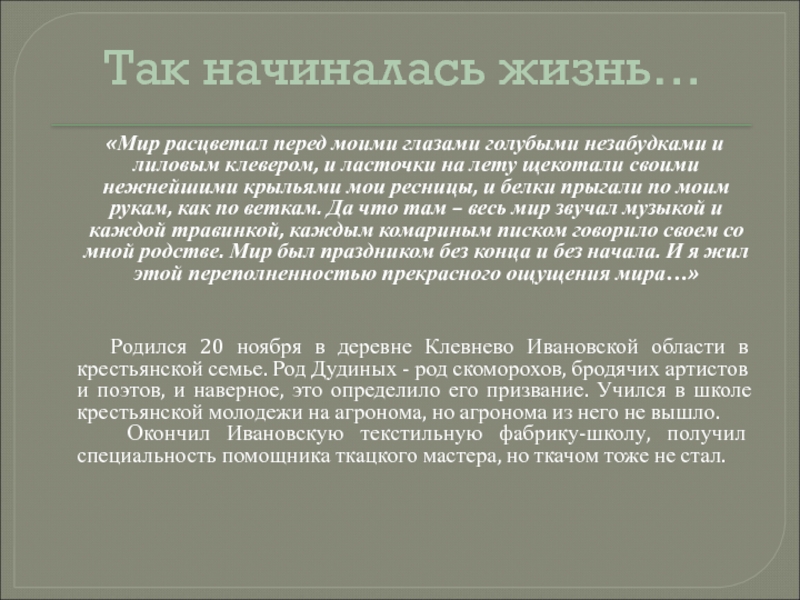 Родился 20 ноября в деревне Клевнево Ивановской области в крестьянской семье. Род Дудиных - род скоморохов, бродячих артистов и поэтов, и наверное, это определило его призвание. Учился в школе крестьянской молодежи на агронома, но агронома из него не вышло.