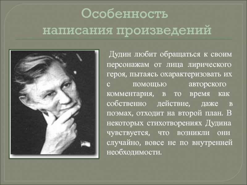 от лица лирического героя, пытаясь охарактеризовать их с помощью авторского комментария, в то время как собственно действие, даже в поэмах, отходит на второй план. В некоторых стихотворениях Дудина чувствуется, что возникли они случайно, вовсе не по внутренней необходимости.