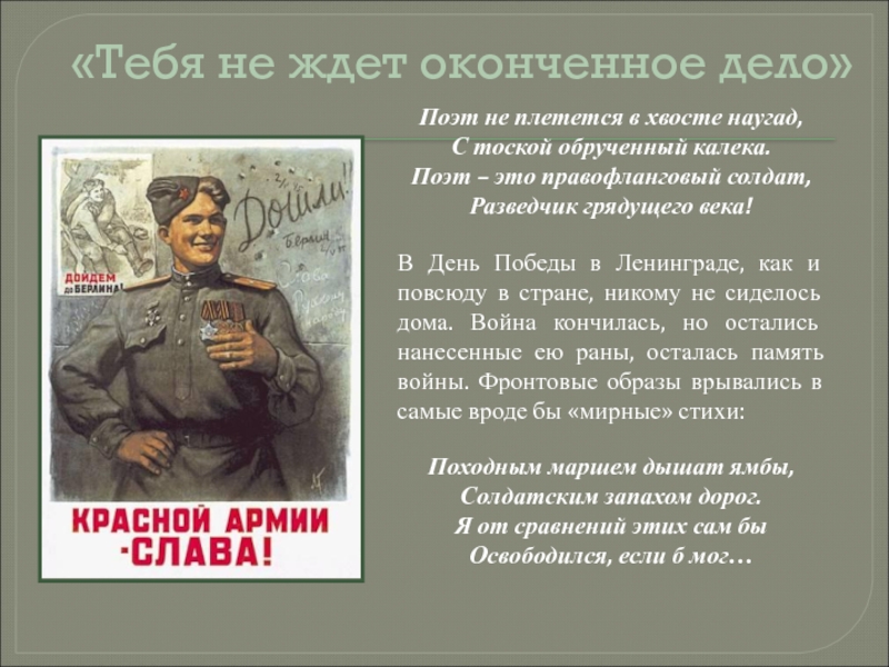 В День Победы в Ленинграде, как и повсюду в стране, никому не сиделось дома. Война кончилась, но остались нанесенные ею раны, осталась память войны. Фронтовые образы врывались в самые вроде бы «мирные» стихи: