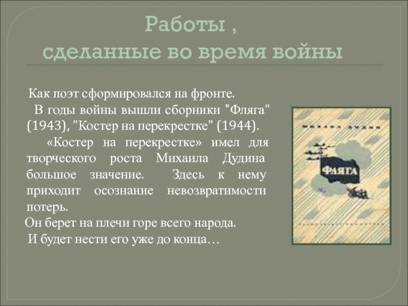 В годы войны вышли сборники "Фляга" (1943), "Костер на перекрестке" (1944).