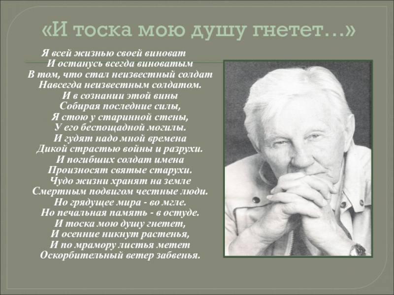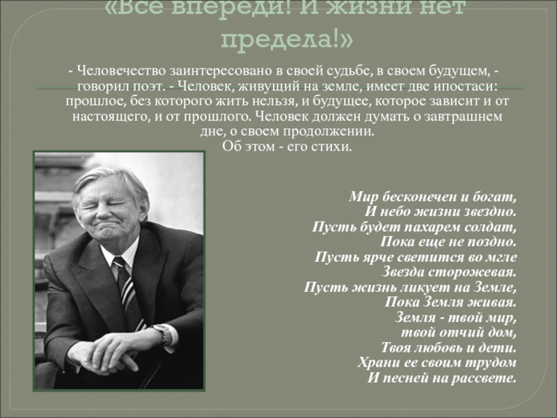 своей судьбе, в своем будущем, - говорил поэт. - Человек, живущий на земле, имеет две ипостаси: прошлое, без которого жить нельзя, и будущее, которое зависит и от настоящего, и от прошлого. Человек должен думать о завтрашнем дне, о своем продолжении.