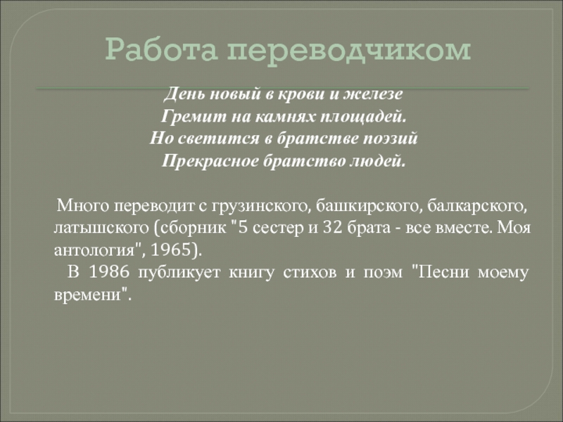 Много переводит с грузинского, башкирского, балкарского, латышского (сборник "5 сестер и 32 брата - все вместе. Моя антология", 1965).