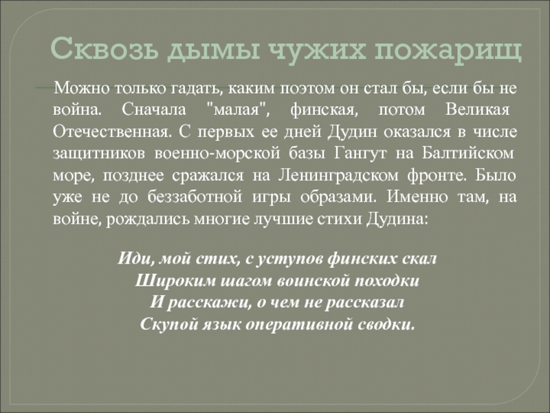 стал бы, если бы не война. Сначала "малая", финская, потом Великая Отечественная. С первых ее дней Дудин оказался в числе защитников военно-морской базы Гангут на Балтийском море, позднее сражался на Ленинградском фронте. Было уже не до беззаботной игры образами. Именно там, на войне, рождались многие лучшие стихи Дудина: