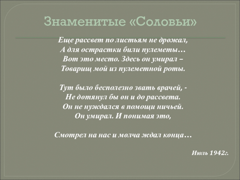 стесняется «громких» слов. Он вынес «окопную правду» на своих плечах и имеет на эти слова моральное право. Они – такая же правда о войне, как раны и гибель. Тем более, что ранами и гибелью и завоеваны слава и бессмертие его товарищей:
