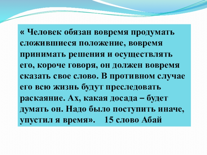осуществлять его, короче говоря, он должен вовремя сказать свое слово. В противном случае его всю жизнь будут преследовать раскаяние. Ах, какая досада – будет думать он. Надо было поступить иначе, упустил я время». 15 слово Абай