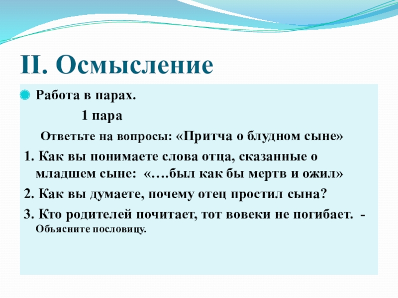 1. Как вы понимаете слова отца, сказанные о младшем сыне: «….был как бы мертв и ожил»