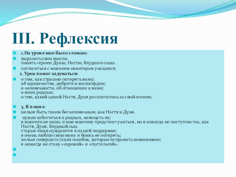 я многого не знаю, и мне многому предстоит учиться, но я никогда не поступлю так, как Настя, Дуня, блудный сын.
