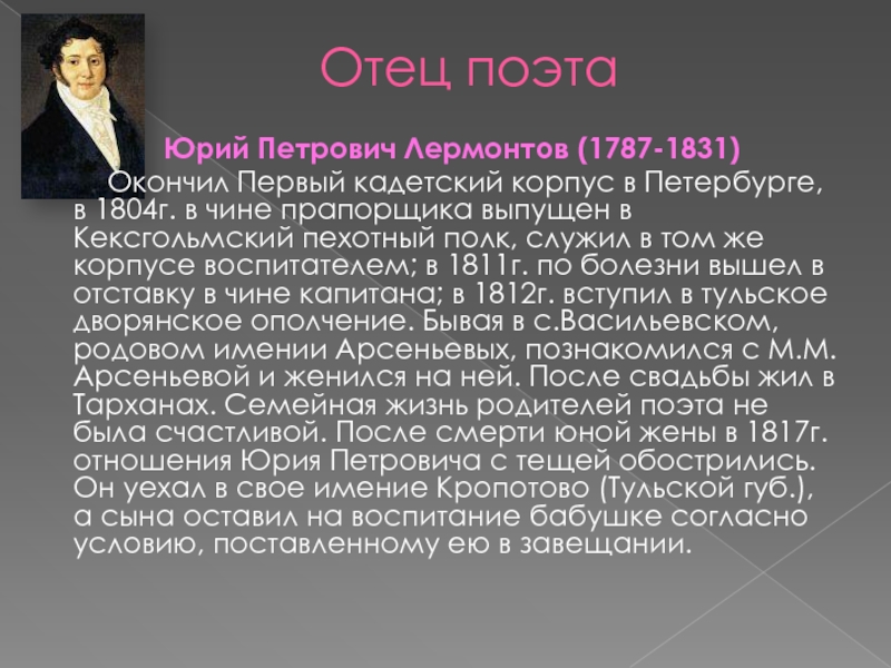 Окончил Первый кадетский корпус в Петербурге, в 1804г. в чине прапорщика выпущен в Кексгольмский пехотный полк, служил в том же корпусе воспитателем; в 1811г. по болезни вышел в отставку в чине капитана; в 1812г. вступил в тульское дворянское ополчение. Бывая в с.Васильевском, родовом имении Арсеньевых, познакомился с М.М.Арсеньевой и женился на ней. После свадьбы жил в Тарханах. Семейная жизнь родителей поэта не была счастливой. После смерти юной жены в 1817г. отношения Юрия Петровича с тещей обострились. Он уехал в свое имение Кропотово (Тульской губ.), а сына оставил на воспитание бабушке согласно условию, поставленному ею в завещании.