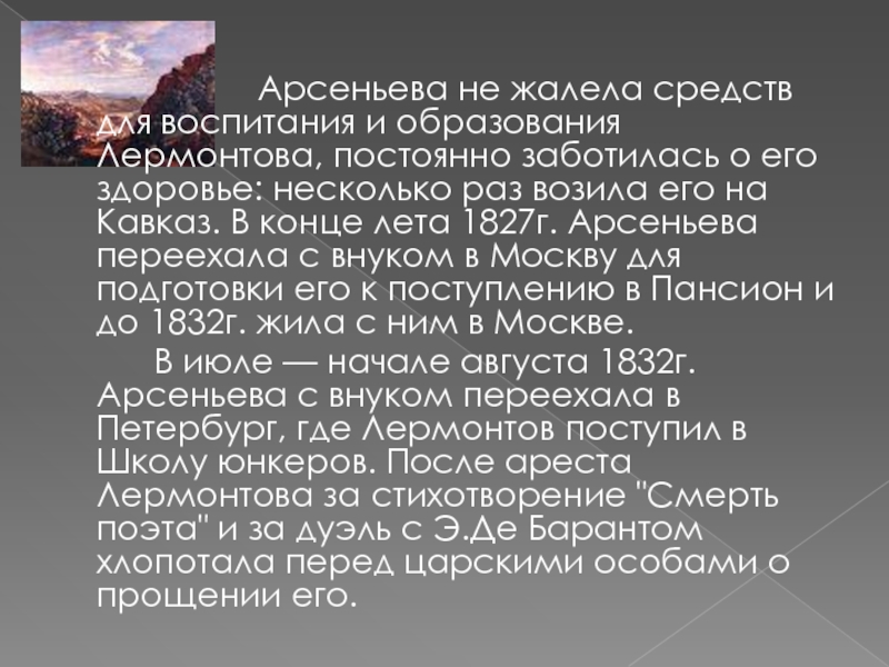 Арсеньева не жалела средств для воспитания и образования Лермонтова, постоянно заботилась о его здоровье: несколько раз возила его на Кавказ. В конце лета 1827г. Арсеньева переехала с внуком в Москву для подготовки его к поступлению в Пансион и до 1832г. жила с ним в Москве.