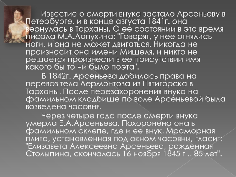 В 1842г. Арсеньева добилась права на перевоз тела Лермонтова из Пятигорска в Тарханы. После перезахоронения внука на фамильном кладбище по воле Арсеньевой была возведена часовня.
