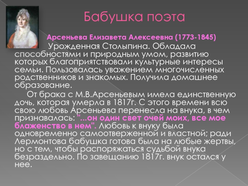 От брака с М.В.Арсеньевым имела единственную дочь, которая умерла в 1817г. С этого времени всю свою любовь Арсеньева перенесла на внука, в чем признавалась: "...он один свет очей моих, все мое блаженство в нем". Любовь к внуку была одновременно самоотверженной и властной; ради Лермонтова бабушка готова была на любые жертвы, но с тем, чтобы распоряжаться судьбой внука безраздельно. По завещанию 1817г. внук остался у нее.