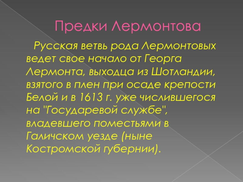 от Георга Лермонта, выходца из Шотландии, взятого в плен при осаде крепости Белой и в 1613 г. уже числившегося на "Государевой службе", владевшего поместьями в Галичском уезде (ныне Костромской губернии).