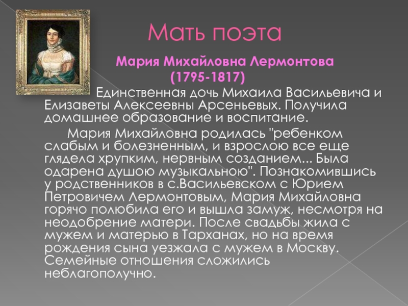 Мария Михайловна родилась "ребенком слабым и болезненным, и взрослою все еще глядела хрупким, нервным созданием... Была одарена душою музыкальною". Познакомившись у родственников в с.Васильевском с Юрием Петровичем Лермонтовым, Мария Михайловна горячо полюбила его и вышла замуж, несмотря на неодобрение матери. После свадьбы жила с мужем и матерью в Тарханах, но на время рождения сына уезжала с мужем в Москву. Семейные отношения сложились неблагополучно.