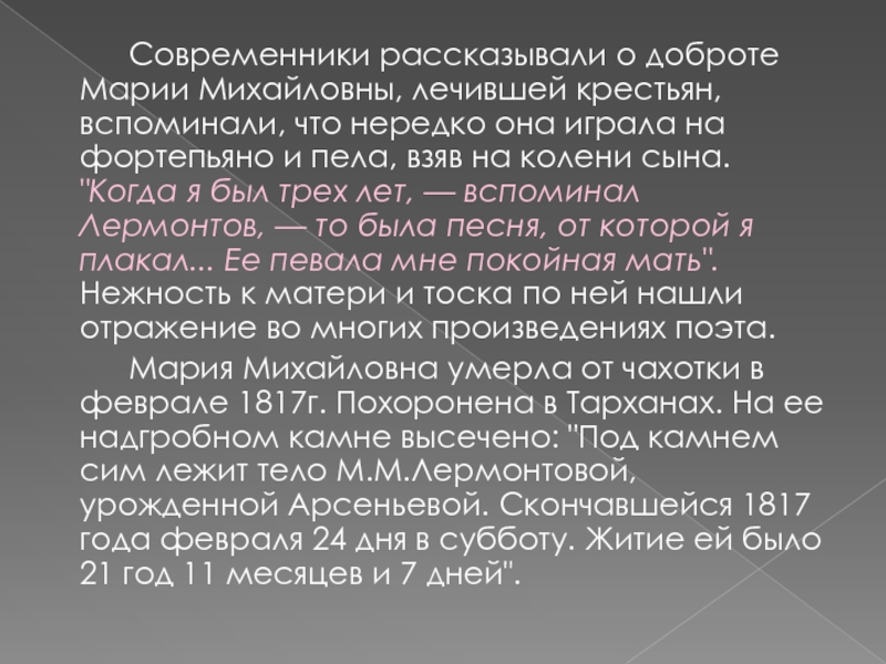 лечившей крестьян, вспоминали, что нередко она играла на фортепьяно и пела, взяв на колени сына. "Когда я был трех лет, — вспоминал Лермонтов, — то была песня, от которой я плакал... Ее певала мне покойная мать". Нежность к матери и тоска по ней нашли отражение во многих произведениях поэта.