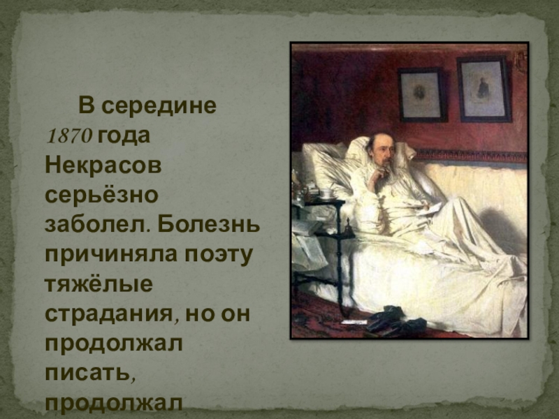 Слайд 13 В середине 1870 года Некрасов серьёзно заболел. Болезнь