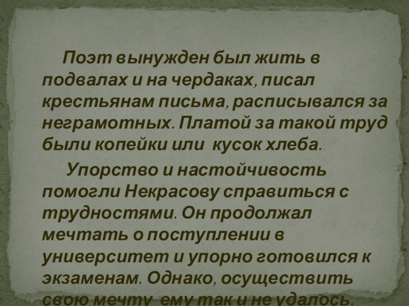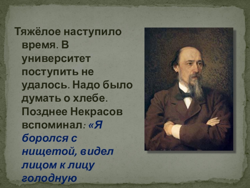 Тяжёлое наступило время. В университет поступить не удалось. Надо было думать о хлебе. Позднее Некрасов вспоминал: «Я