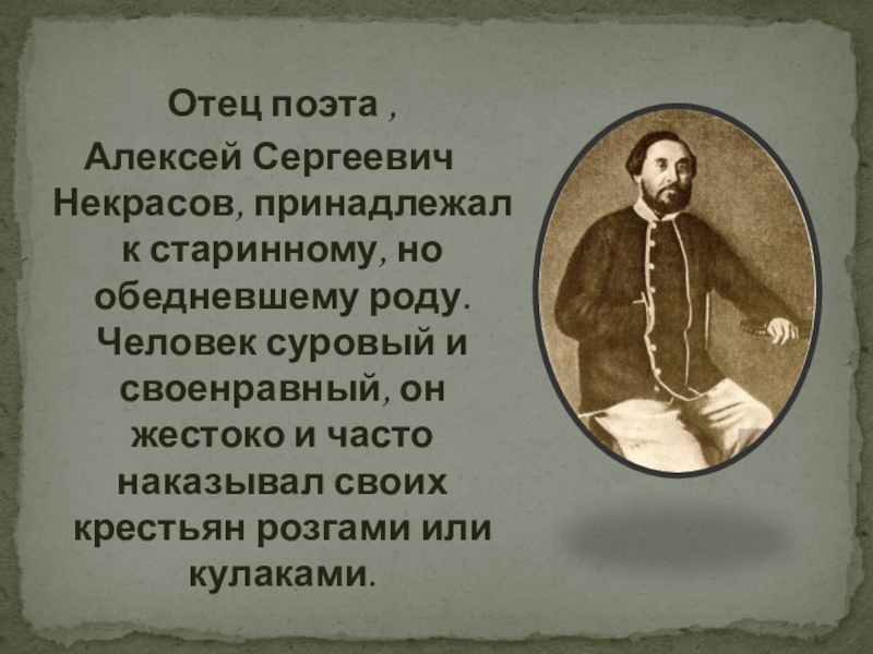 Отец поэта ,Алексей Сергеевич Некрасов, принадлежал к старинному, но обедневшему роду. Человек суровый и своенравный,