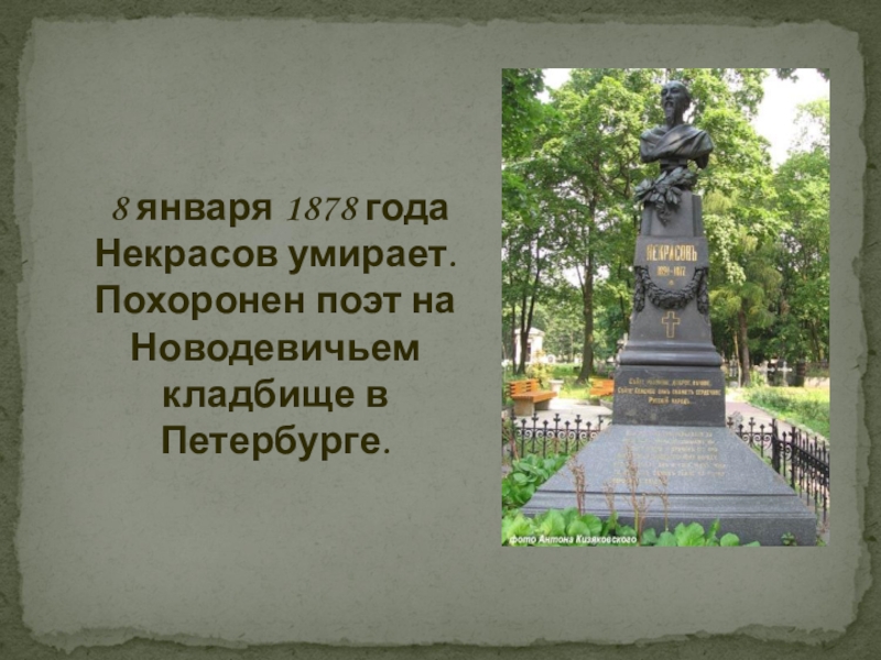8 января 1878 года Некрасов умирает.Похоронен поэт на Новодевичьем кладбище в Петербурге.