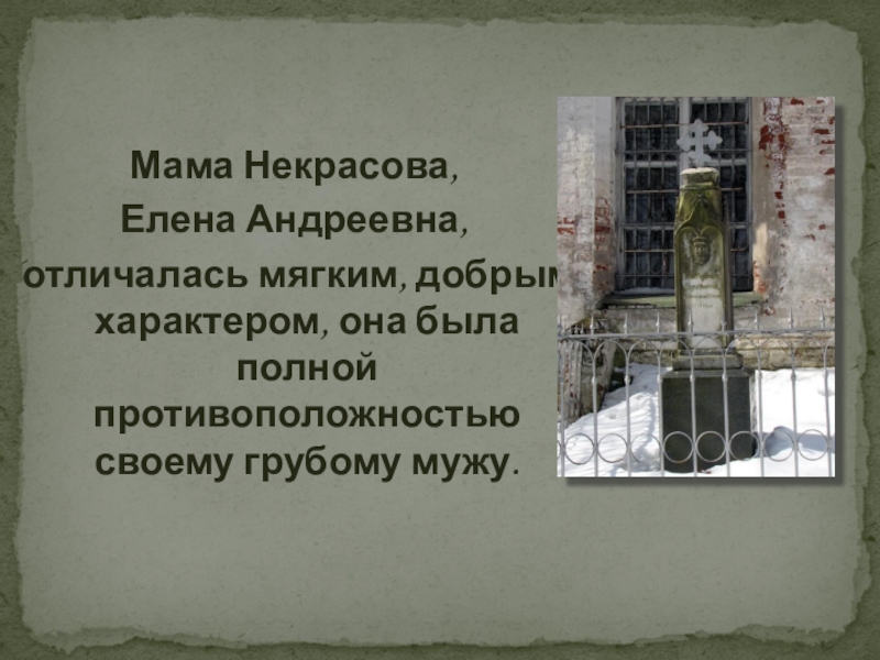 Мама Некрасова, Елена Андреевна, отличалась мягким, добрым характером, она была полной противоположностью своему грубому мужу.