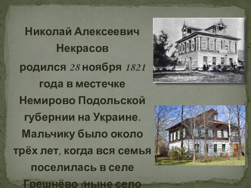 Николай Алексеевич Некрасов родился 28 ноября 1821 года в местечке Немирово Подольской губернии на Украине. Мальчику было