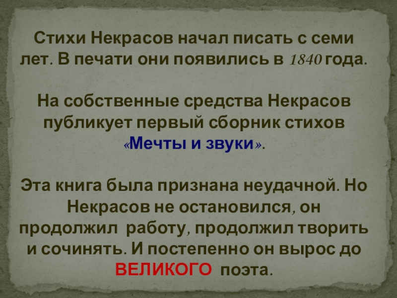 Слайд 11Стихи Некрасов начал писать с семи лет. В печати они появились