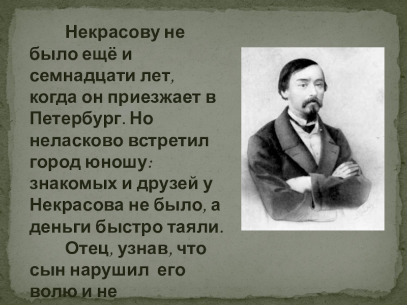 лет, когда он приезжает в Петербург. Но неласково встретил город юношу: знакомых и друзей у Некрасова не было, а деньги быстро таяли.