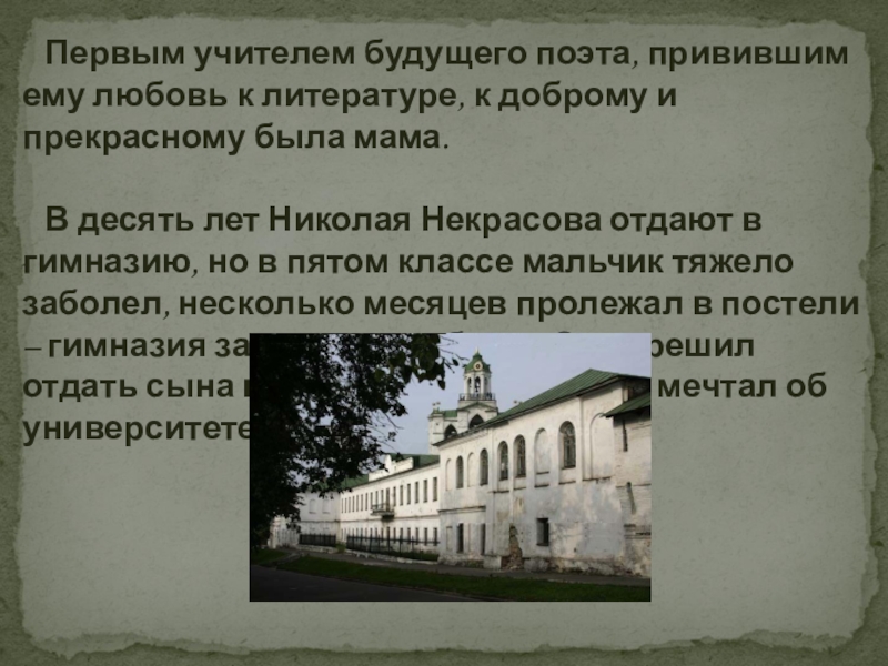 В десять лет Николая Некрасова отдают в гимназию, но в пятом классе мальчик тяжело заболел, несколько месяцев пролежал в постели – гимназия закончена не была. Отец решил отдать сына в военную школу, а сын мечтал об университете.