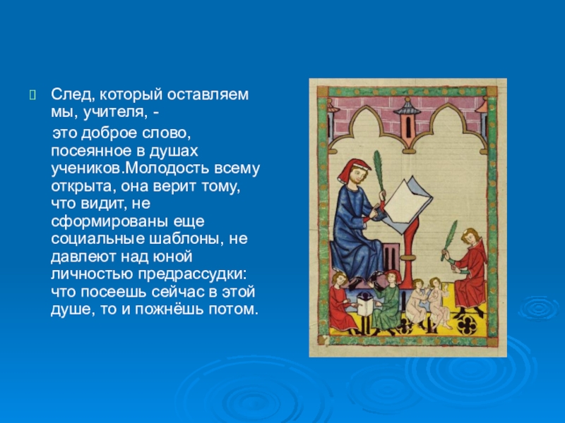 слово, посеянное в душах учеников.Молодость всему открыта, она верит тому, что видит, не сформированы еще социальные шаблоны, не давлеют над юной личностью предрассудки: что посеешь сейчас в этой душе, то и пожнёшь потом.