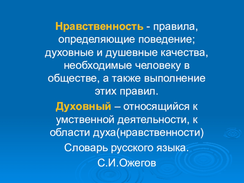Нравственность - правила, определяющие поведение; духовные и душевные качества, необходимые человеку в обществе, а также выполнение этих правил.Духовный – относящийся к умственной деятельности, к области духа(нравственности)Словарь русского языка. С.И.Ожегов