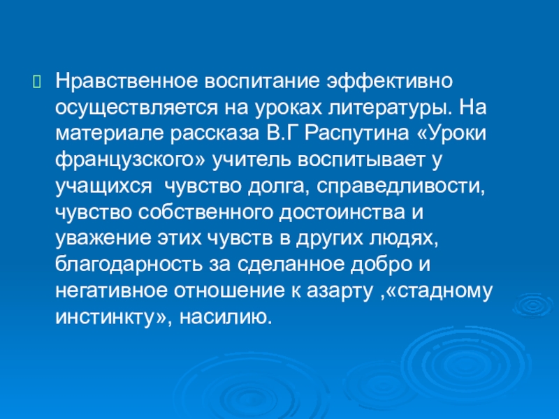 Распутина «Уроки французского» учитель воспитывает у учащихся чувство долга, справедливости, чувство собственного достоинства и уважение этих чувств в других людях, благодарность за сделанное добро и негативное отношение к азарту ,«стадному инстинкту», насилию.