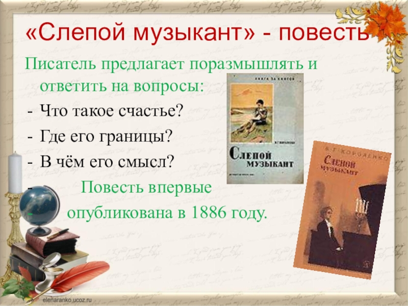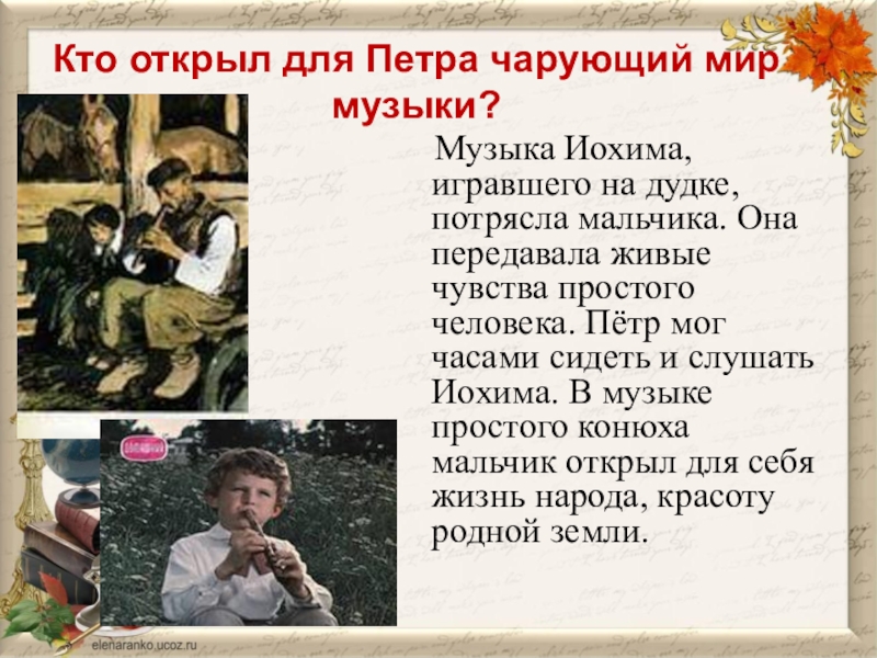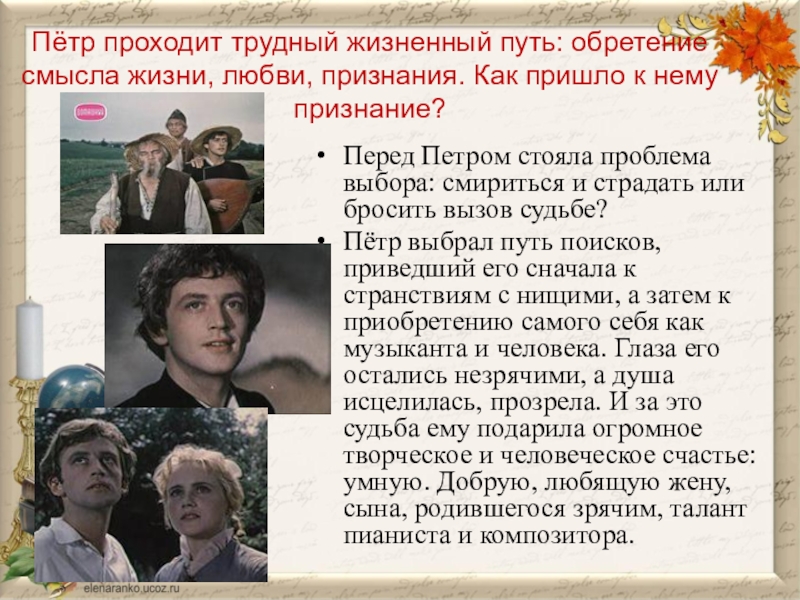 Пётр выбрал путь поисков, приведший его сначала к странствиям с нищими, а затем к приобретению самого себя как музыканта и человека. Глаза его остались незрячими, а душа исцелилась, прозрела. И за это судьба ему подарила огромное творческое и человеческое счастье: умную. Добрую, любящую жену, сына, родившегося зрячим, талант пианиста и композитора.