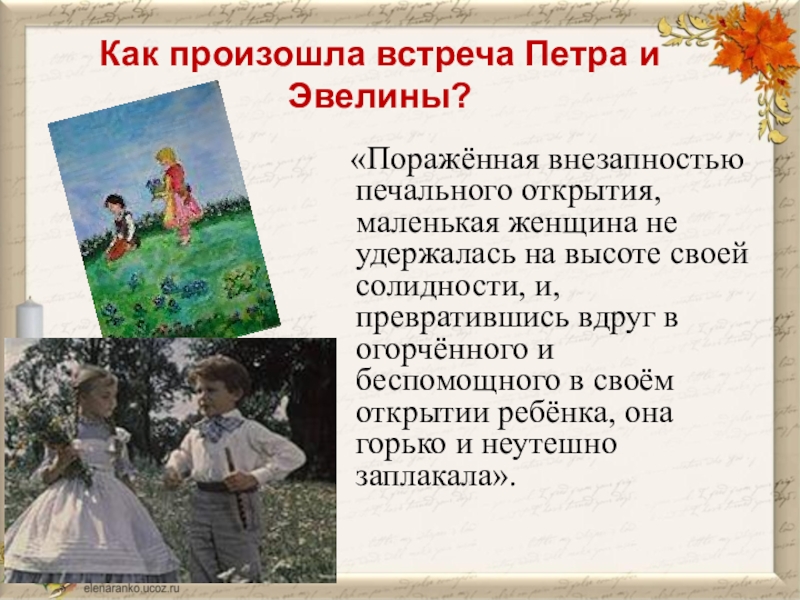 «Он сжал её маленькую руку в своей…Сам он показался себе могучим и сильным. А она представилась плачущей и слабой. Тогда под влиянием глубокой нежности, он привлёк её одной рукою, а другой стал гладить её шелковистые волосы».
