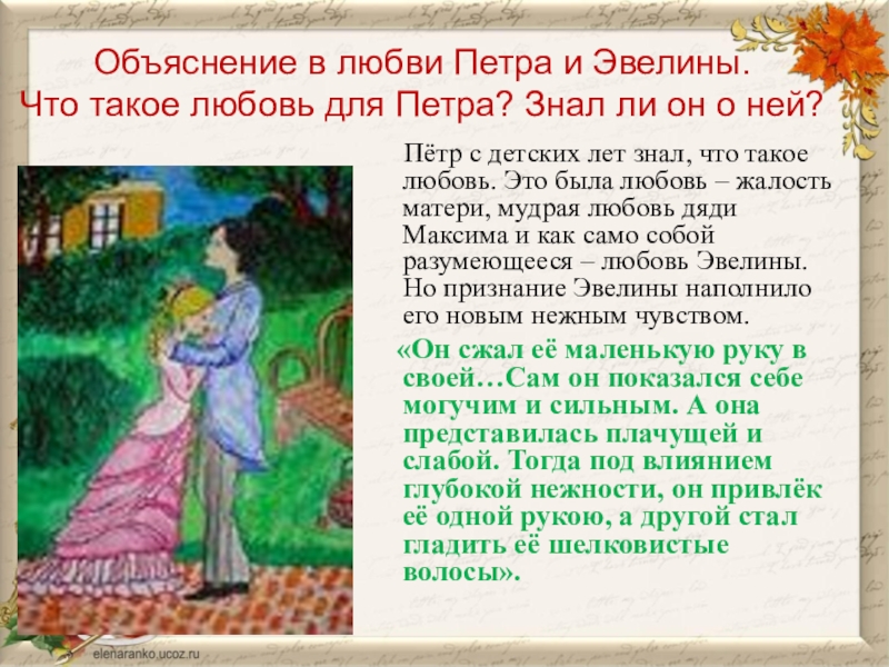 Пётр с детских лет знал, что такое любовь. Это была любовь – жалость матери, мудрая любовь дяди Максима и как само собой разумеющееся – любовь Эвелины. Но признание Эвелины наполнило его новым нежным чувством.