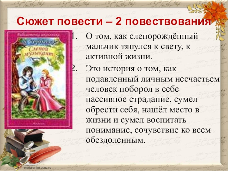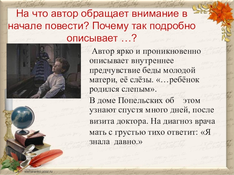 Автор ярко и проникновенно описывает внутреннее предчувствие беды молодой матери, её слёзы. «…ребёнок родился слепым».