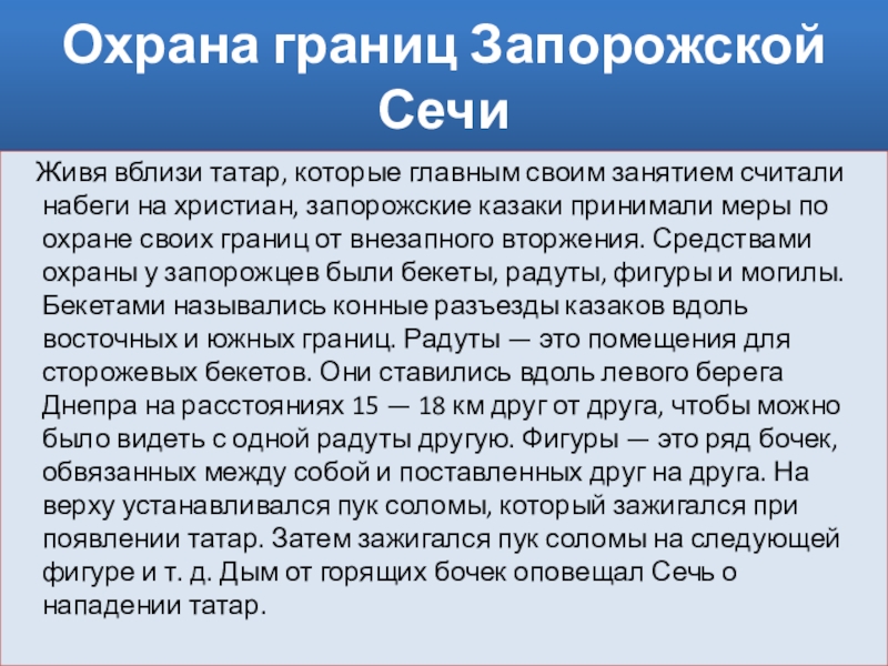своим занятием считали набеги на христиан, запорожские казаки принимали меры по охране своих границ от внезапного вторжения. Средствами охраны у запорожцев были бекеты, радуты, фигуры и могилы. Бекетами назывались конные разъезды казаков вдоль восточных и южных границ. Радуты — это помещения для сторожевых бекетов. Они ставились вдоль левого берега Днепра на расстояниях 15 — 18 км друг от друга, чтобы можно было видеть с одной радуты другую. Фигуры — это ряд бочек, обвязанных между собой и поставленных друг на друга. На верху устанавливался пук соломы, который зажигался при появлении татар. Затем зажигался пук соломы на следующей фигуре и т. д. Дым от горящих бочек оповещал Сечь о нападении татар.