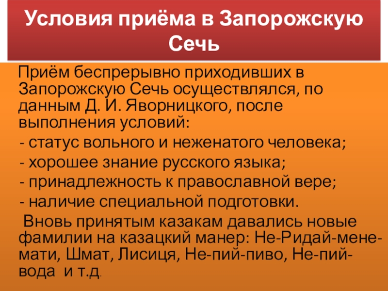 приходивших в Запорожскую Сечь осуществлялся, по данным Д. И. Яворницкого, после выполнения условий: