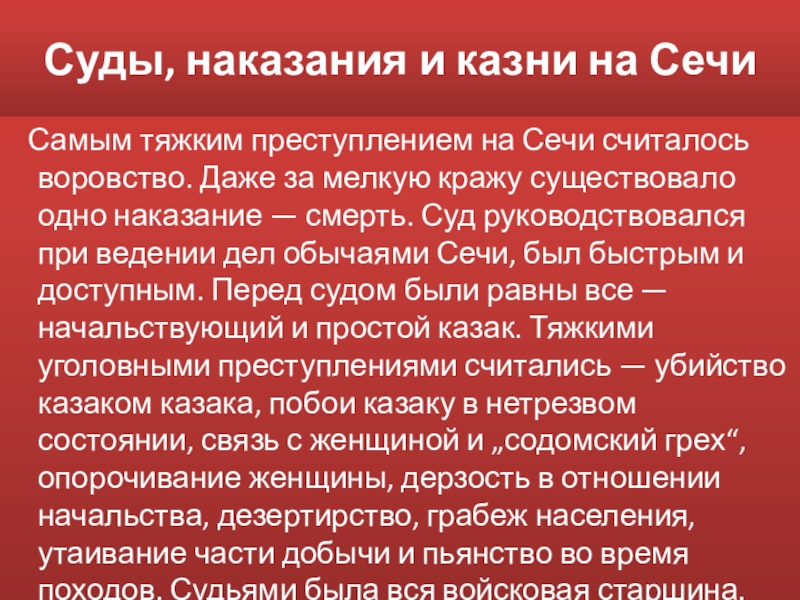 Сечи считалось воровство. Даже за мелкую кражу существовало одно наказание — смерть. Суд руководствовался при ведении дел обычаями Сечи, был быстрым и доступным. Перед судом были равны все — начальствующий и простой казак. Тяжкими уголовными преступлениями считались — убийство казаком казака, побои казаку в нетрезвом состоянии, связь с женщиной и „содомский грех“, опорочивание женщины, дерзость в отношении начальства, дезертирство, грабеж населения, утаивание части добычи и пьянство во время походов. Судьями была вся войсковая старшина.