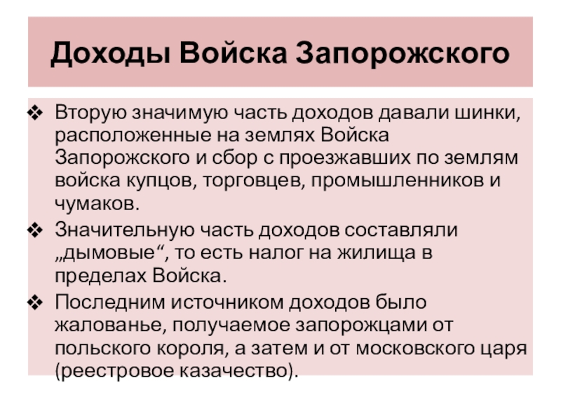 Войска Запорожского и сбор с проезжавших по землям войска купцов, торговцев, промышленников и чумаков.