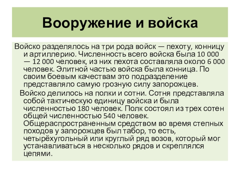 и артиллерию. Численность всего войска была 10 000 — 12 000 человек, из них пехота составляла около 6 000 человек. Элитной частью войска была конница. По своим боевым качествам это подразделение представляло самую грозную силу запорожцев.