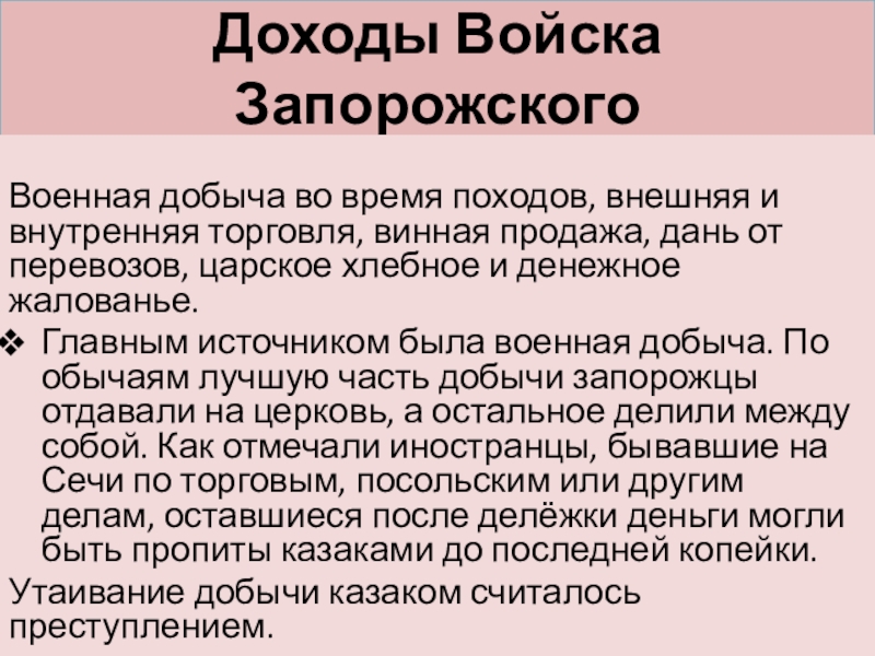 Главным источником была военная добыча. По обычаям лучшую часть добычи запорожцы отдавали на церковь, а остальное делили между собой. Как отмечали иностранцы, бывавшие на Сечи по торговым, посольским или другим делам, оставшиеся после делёжки деньги могли быть пропиты казаками до последней копейки.