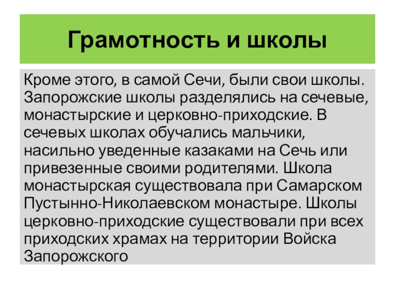 Кроме этого, в самой Сечи, были свои школы. Запорожские