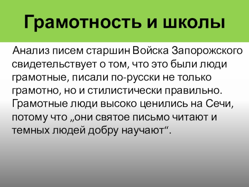 том, что это были люди грамотные, писали по-русски не только грамотно, но и стилистически правильно. Грамотные люди высоко ценились на Сечи, потому что „они святое письмо читают и темных людей добру научают“.