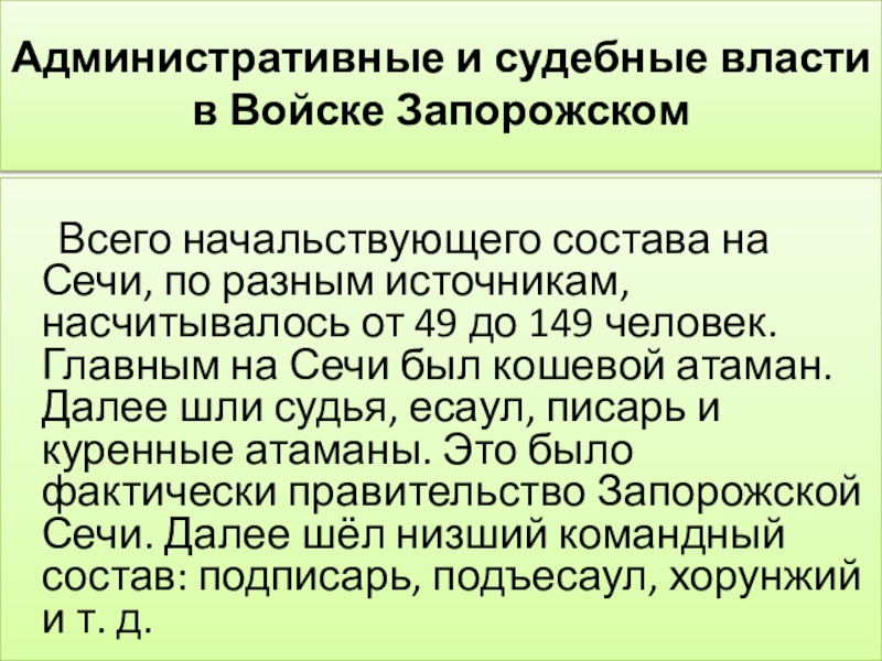 состава на Сечи, по разным источникам, насчитывалось от 49 до 149 человек. Главным на Сечи был кошевой атаман. Далее шли судья, есаул, писарь и куренные атаманы. Это было фактически правительство Запорожской Сечи. Далее шёл низший командный состав: подписарь, подъесаул, хорунжий и т. д.
