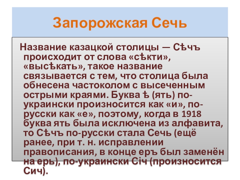 «сѣкти», «высѣкать», такое название связывается с тем, что столица была обнесена частоколом с высеченным острыми краями. Буква ѣ (ять) по-украински произносится как «и», по-русски как «е», поэтому, когда в 1918 буква ять была исключена из алфавита, то Сѣчъ по-русски стала Сечь (ещё ранее, при т. н. исправлении правописания, в конце еръ был заменён на ерь), по-украински Січ (произносится Сич).