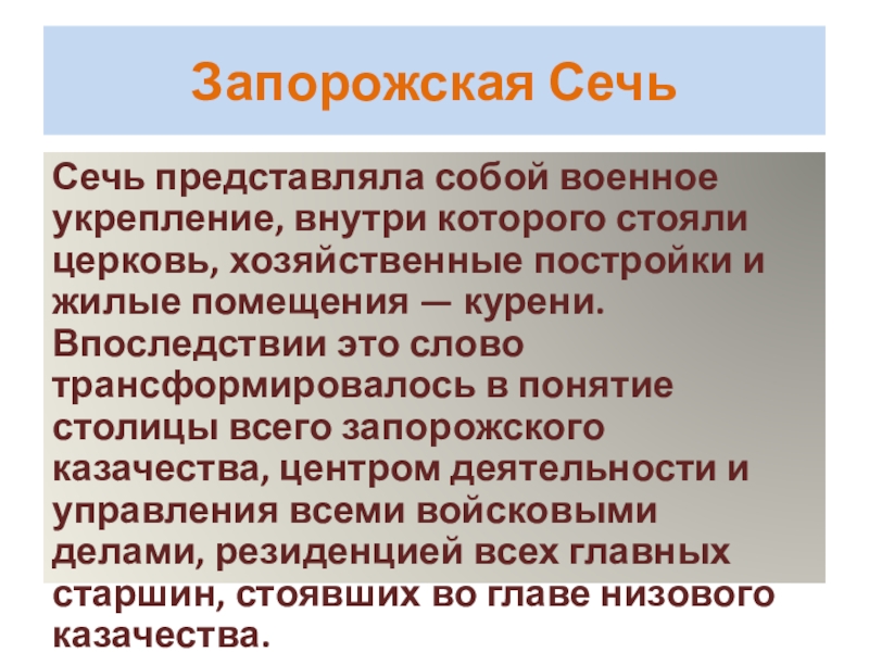 постройки и жилые помещения — курени. Впоследствии это слово трансформировалось в понятие столицы всего запорожского казачества, центром деятельности и управления всеми войсковыми делами, резиденцией всех главных старшин, стоявших во главе низового казачества.