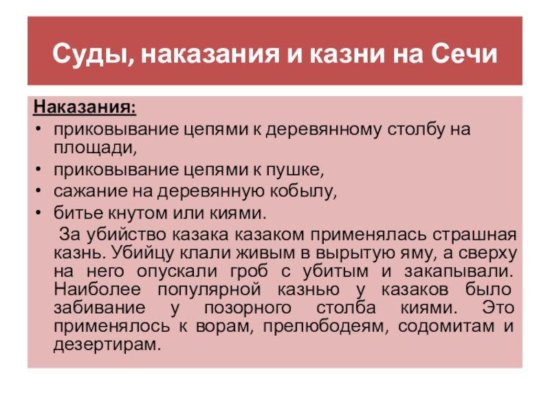 За убийство казака казаком применялась страшная казнь. Убийцу клали живым в вырытую яму, а сверху на него опускали гроб с убитым и закапывали. Наиболее популярной казнью у казаков было забивание у позорного столба киями. Это применялось к ворам, прелюбодеям, содомитам и дезертирам.