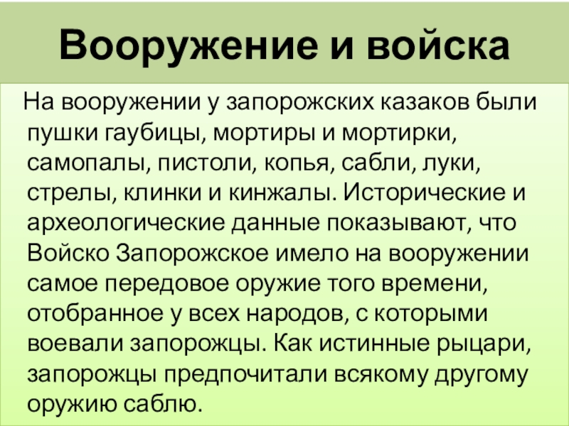 гаубицы, мортиры и мортирки, самопалы, пистоли, копья, сабли, луки, стрелы, клинки и кинжалы. Исторические и археологические данные показывают, что Войско Запорожское имело на вооружении самое передовое оружие того времени, отобранное у всех народов, с которыми воевали запорожцы. Как истинные рыцари, запорожцы предпочитали всякому другому оружию саблю.